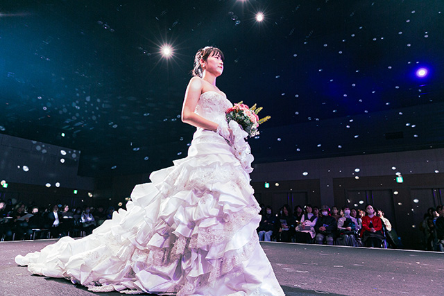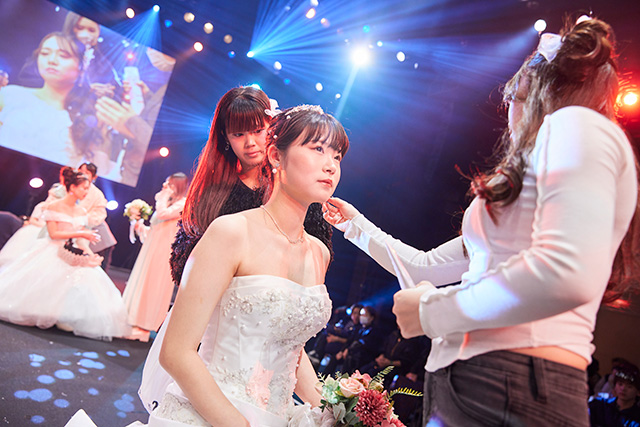 ▲-ウエディング部門で参加した関美学園芸術祭。ステージの上でスポットライトを浴びながら花嫁さんを作り上げます!