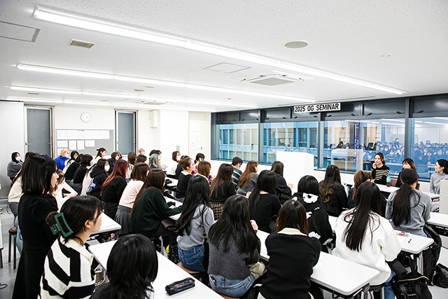 ▲-実際に有名ブランドでビューティアドバイザーとして活躍する先輩から話が聞ける「OGセミナー」などもあり、憧れのブランドで働く先輩のリアルな話は自分の進路を決めるのに役立ちます。-