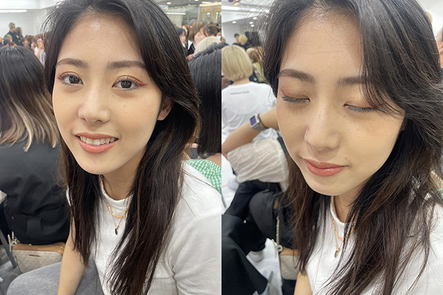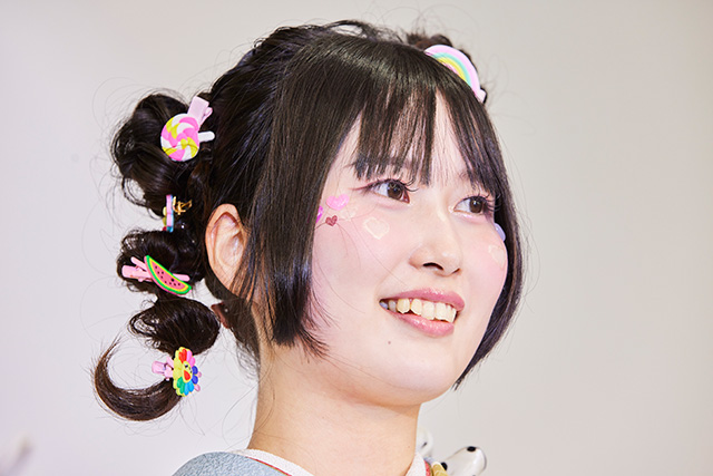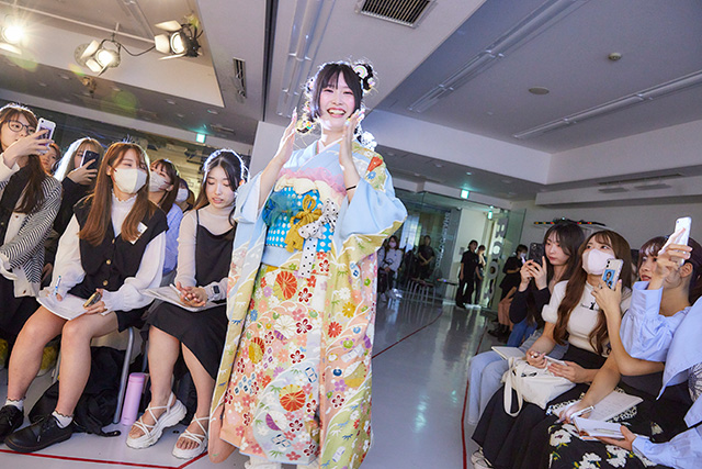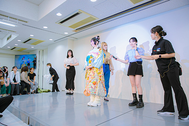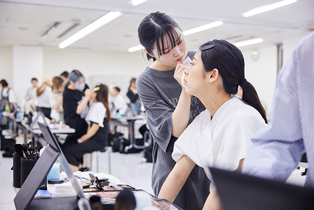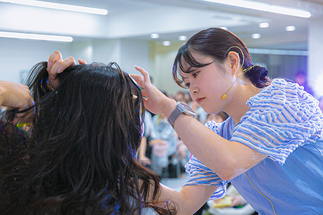 他学科の学生たちと共にステージに上り、「原宿系可愛い」をテーマにメイク技術を披露されました。