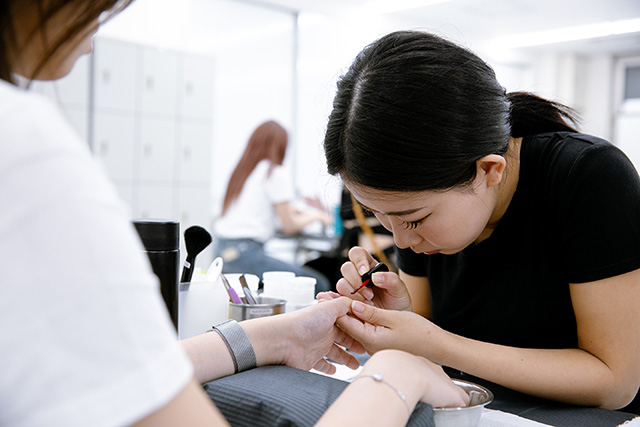 モデルの右手は甘皮のケア、左手には赤色のポリッシュを塗っていきます❗️