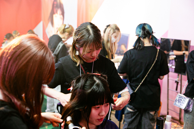 バックヤードでは、二人一組になってヘアメイクをしていき一人のモデルさんを仕上げていきます💨