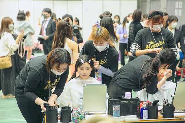 ▲-関西コレクションのバックヤードで、ビューティプロ&KANBI の学生が、キッズモデルやダンサーの方にヘアメイクを施します。自分の手掛けたモデルさんがランウェイを歩く姿に感動!