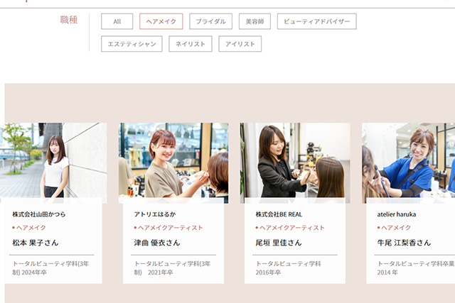 ▲-卒業後の進路はそれぞれですが、ヘアメイクとして活躍する先輩達をHPでも一部ご紹介してます。