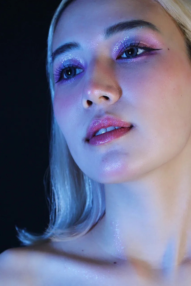作品タイトル「七変化」とは、「紫陽花」の別名であり、紫陽花は土壌の性質や時間帯によって様々な色に変化します。 その紫陽花の性質をアイシャドウの色味で表現し、梅雨の時期に多く咲く花のため、液状のグリッターで雨の儚さを演出しました。