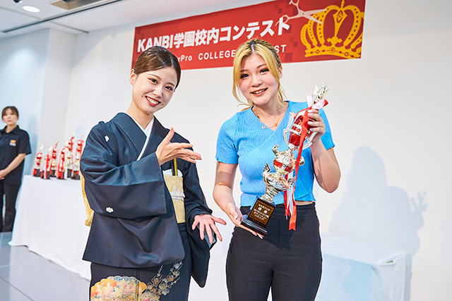 特に、アートデザインチップと似合わせメイクでは【2.3年】【1年】両部門ともビューティプロ生が上位を独占☆2年ヘアアレンジや、留袖着付、ネイルケア・カラー、そしてもちろんエステでもグランプリを獲得。ビューティプロの強みを活かして、しっかりと結果を残せました。