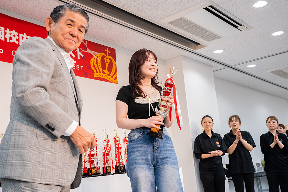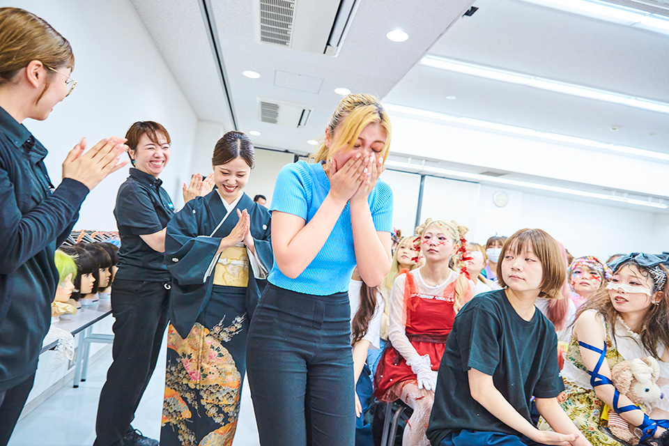 特に、アートデザインチップと似合わせメイクでは【2.3年】【1年】両部門ともビューティプロ生が上位を独占☆2年ヘアアレンジや、留袖着付、ネイルケア・カラー、そしてもちろんエステでもグランプリを獲得。ビューティプロの強みを活かして、しっかりと結果を残せました。