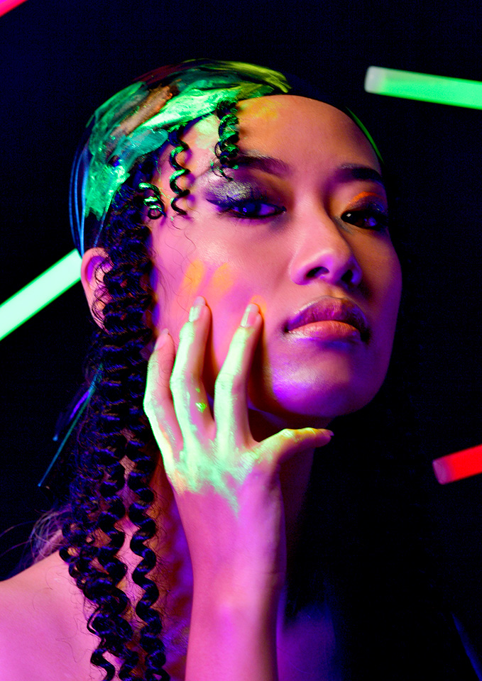 蛍光色をたくさん使ったので、際立つようにブルーライトを使用したのですが、蛍光色独特の光とモデルにしたメイクの両方が映えるように、ライトの位置や強さを調整したところです。