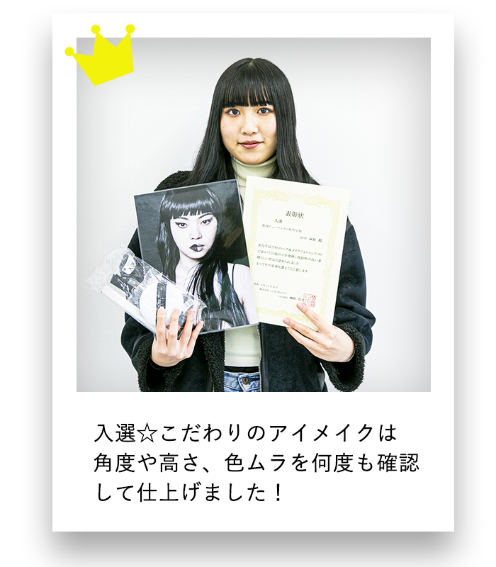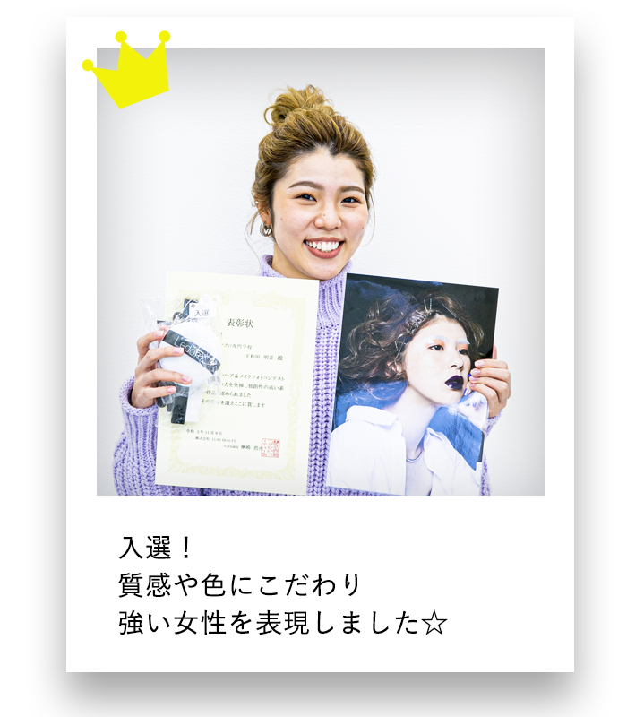 授業でメイクアップアーティストとカメラマンの方と、本格的な撮影をさせていただける機会があり、たくさんの技術を教えてもらって作った自分の作品で、なにか結果を残すことができればいいなと思い、今回チャレンジしました。