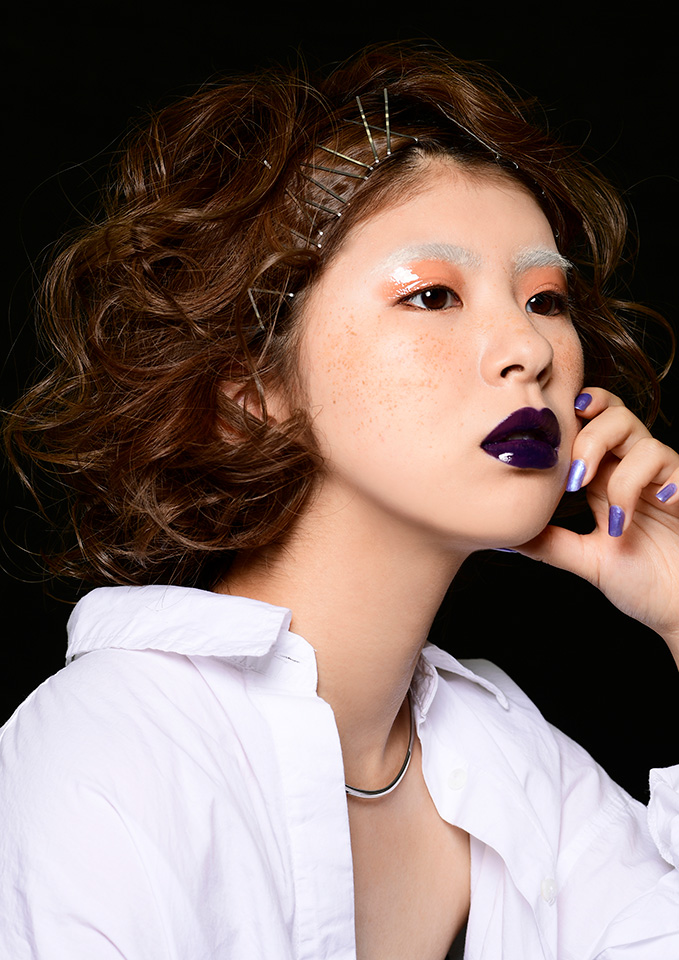 シャープなメイクやタイトなヘアスタイルではなく、質感や色にこだわり強い女性を表現しました。個性は何より大切だと思っているので、ボリュームあるヘアにそばかすを付けました。