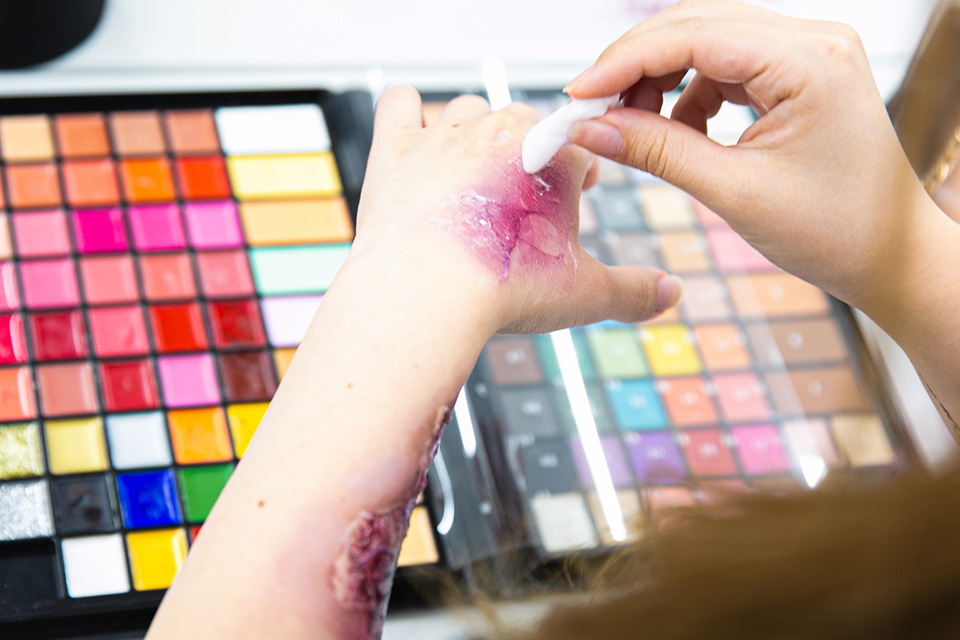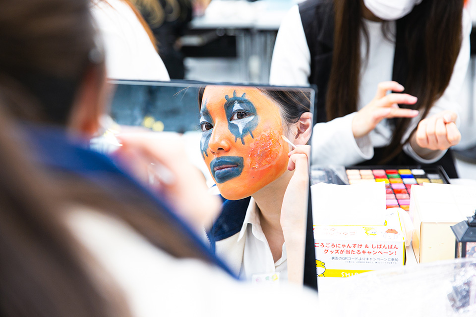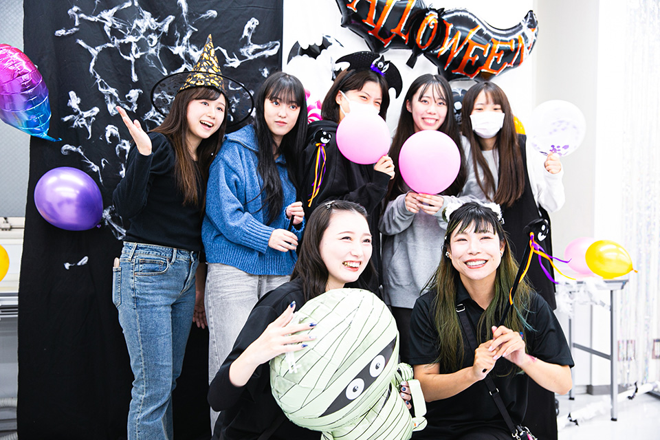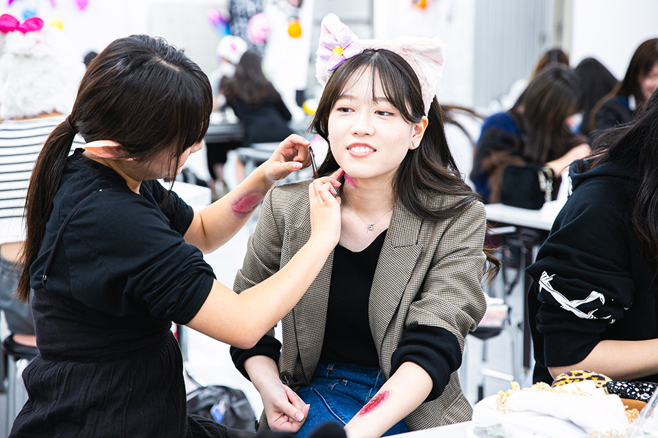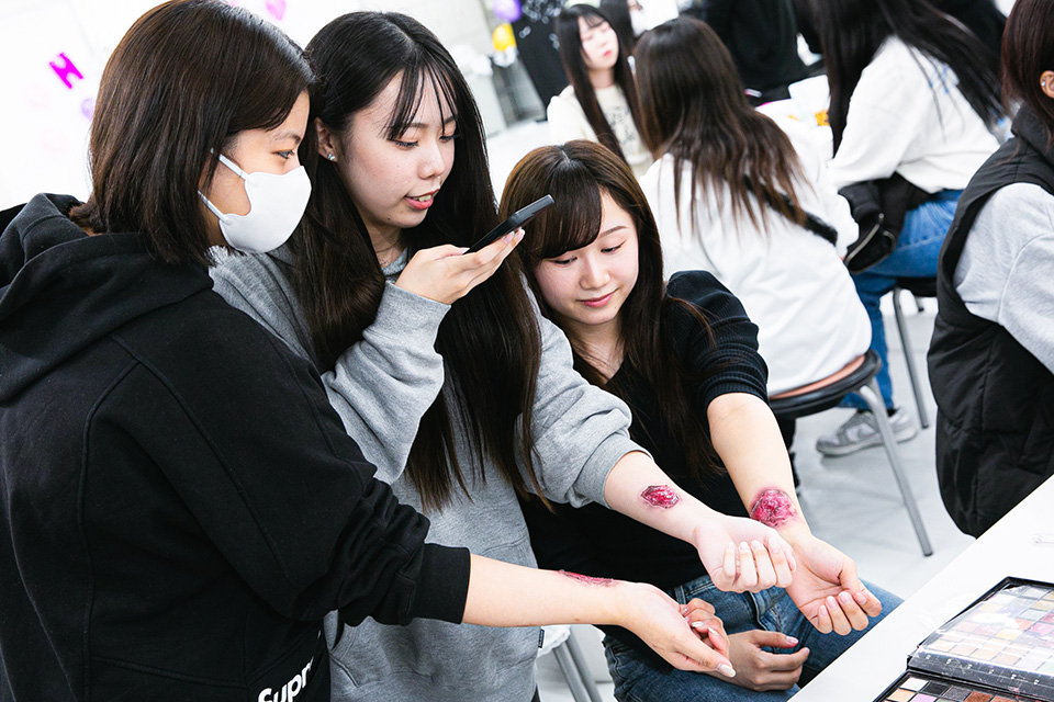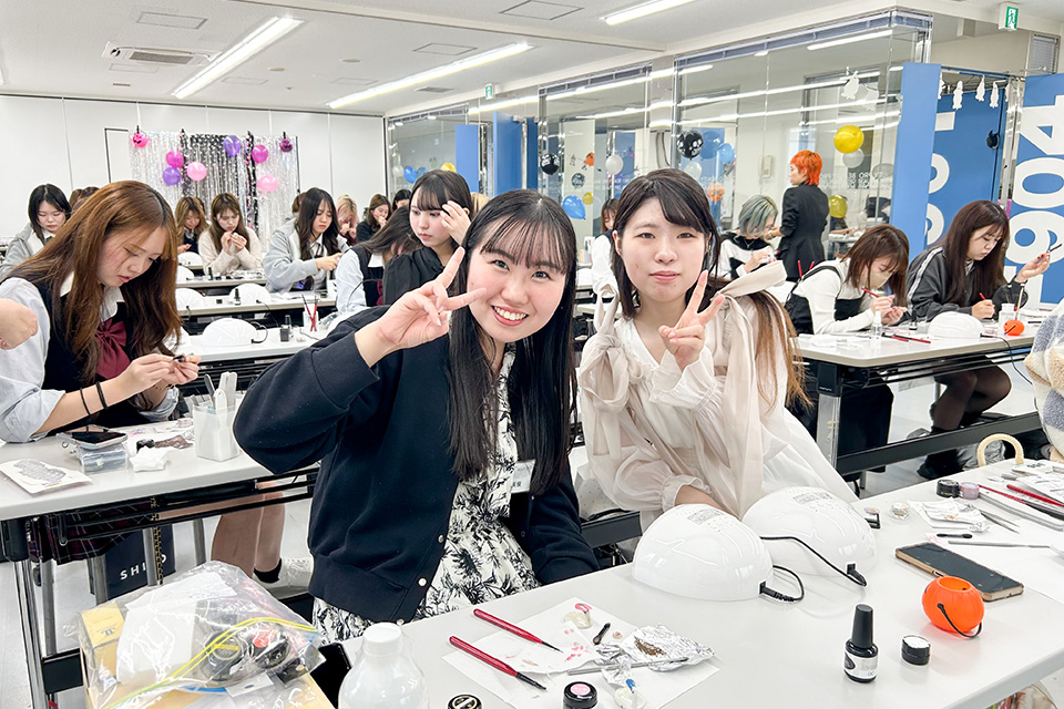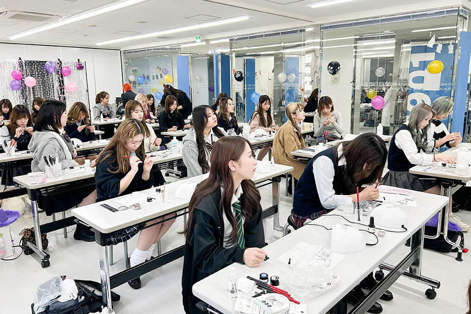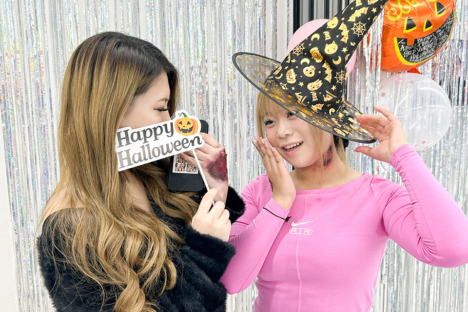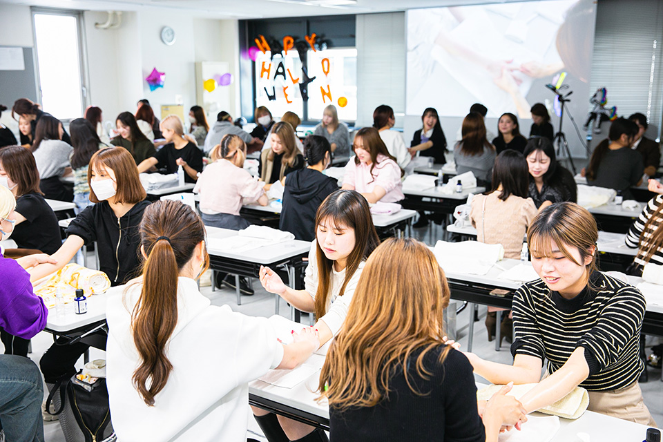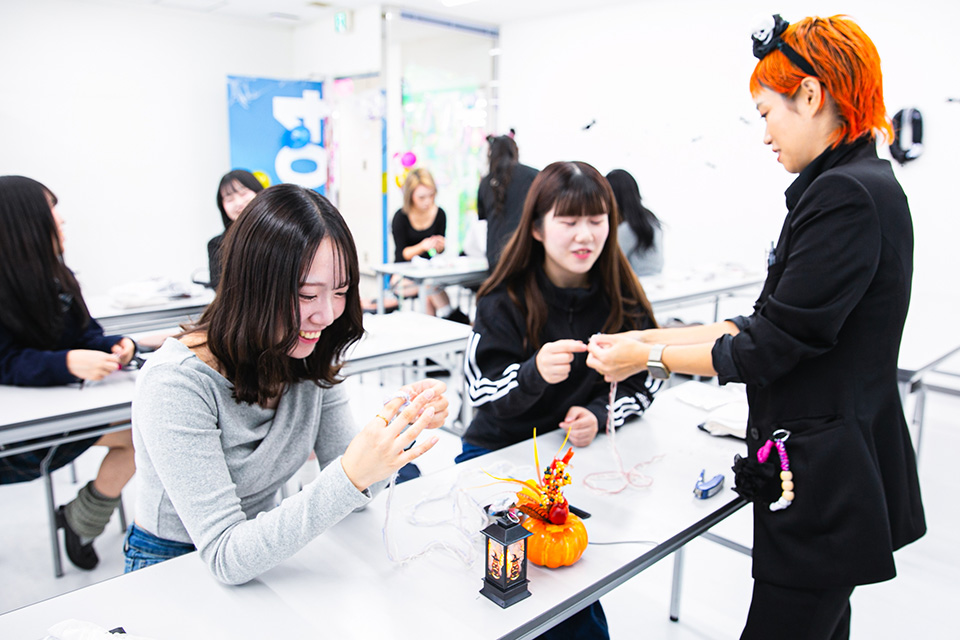 ハロウィーンの特別イベントを開催☆この日は仮装OK!『傷・痣メイク』やハロウィーンイメージのシーリングネイルやミラーネイル、そしていろんな可愛いシュシュ作りなど面白い授業がいっぱい☆いつも資格取得に向けてがんばる学生達もちょっと息抜き。楽しい時間を過ごしました。
