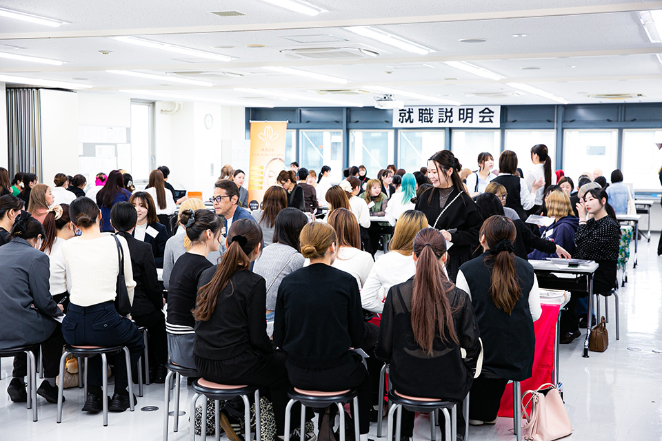 2025年度の就職説明会を開催いたしました。エステティシャン、ビューティアドバイザー、ネイリスト、美容師、アイリスト、ブライダルスタイリストにヘアメイクなど、キレイの世界のスペシャリストとなるために、日々技術を磨くビューティプロ生。
