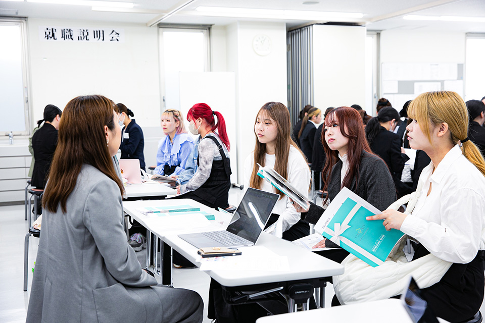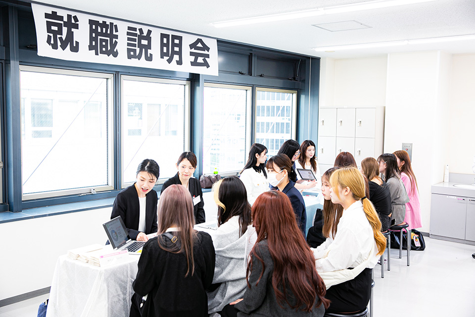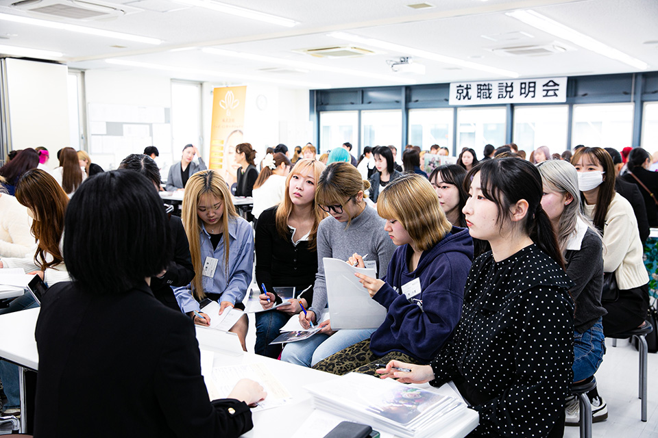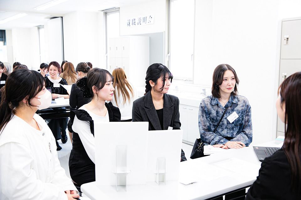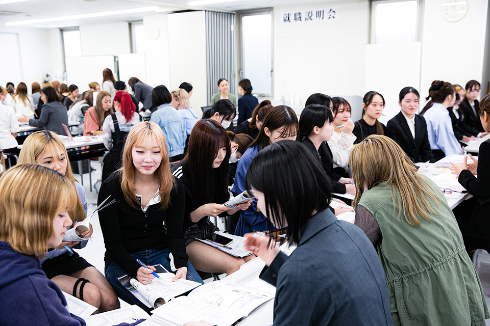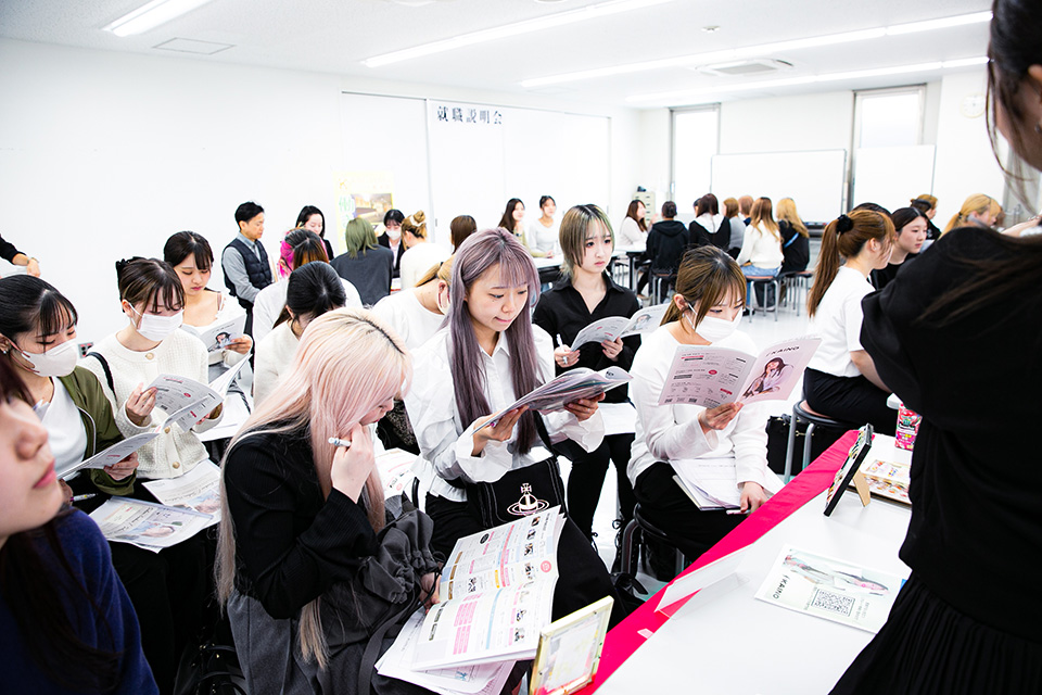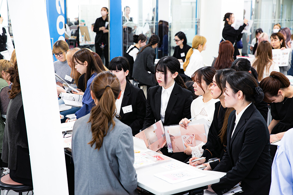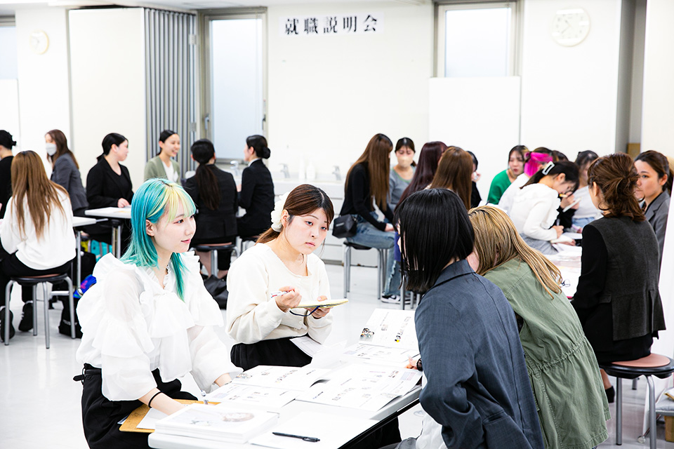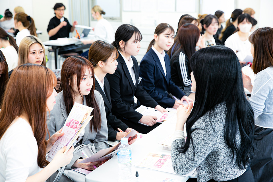 2025年度の就職説明会を開催いたしました。エステティシャン、ビューティアドバイザー、ネイリスト、美容師、アイリスト、ブライダルスタイリストにヘアメイクなど、キレイの世界のスペシャリストとなるために、日々技術を磨くビューティプロ生。