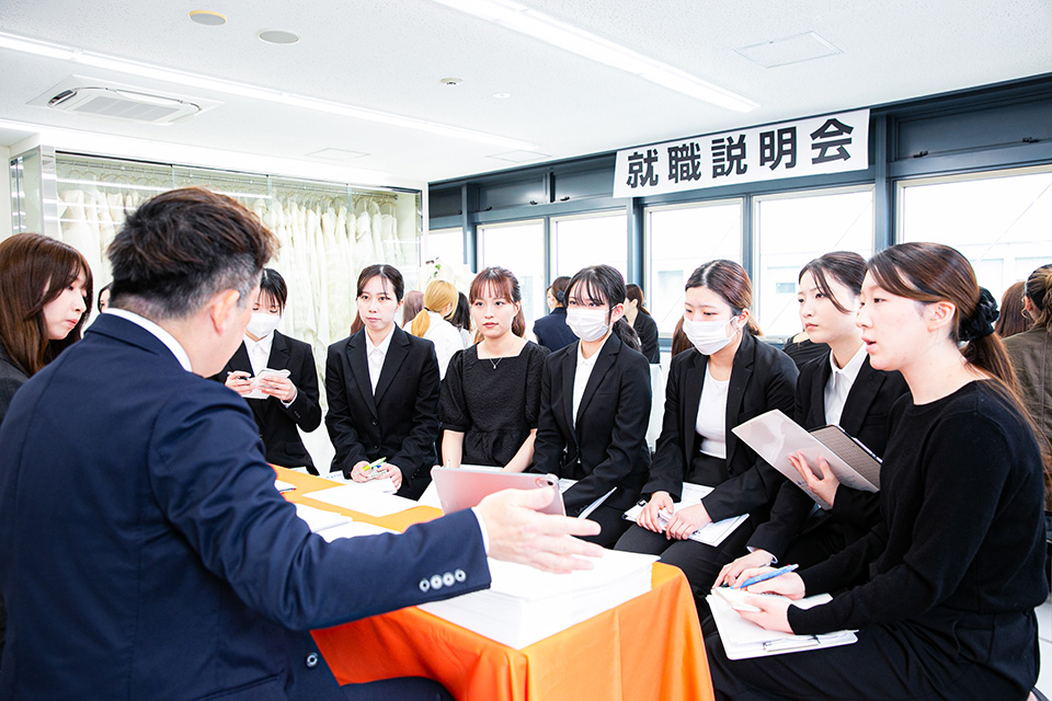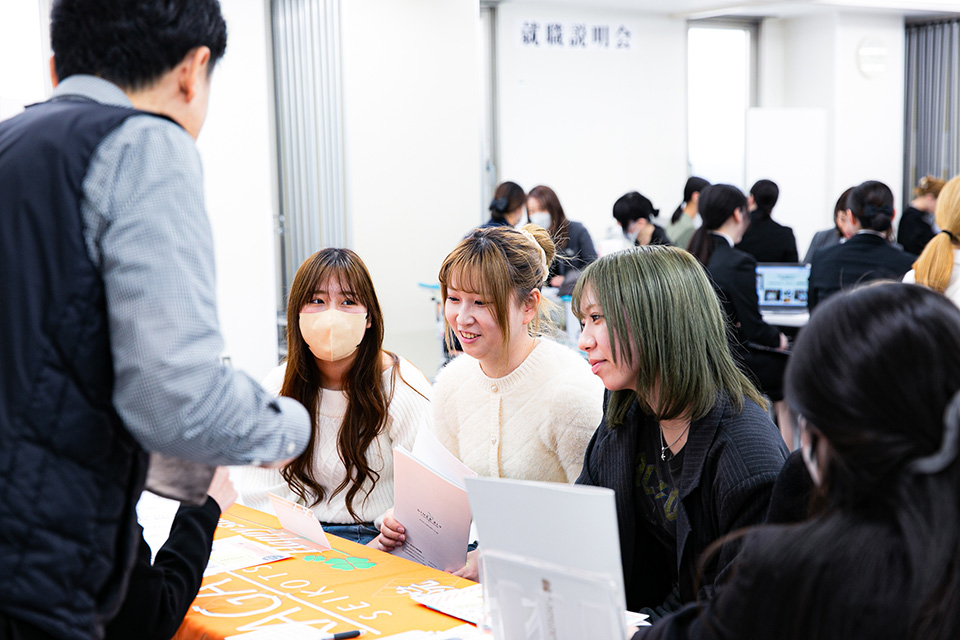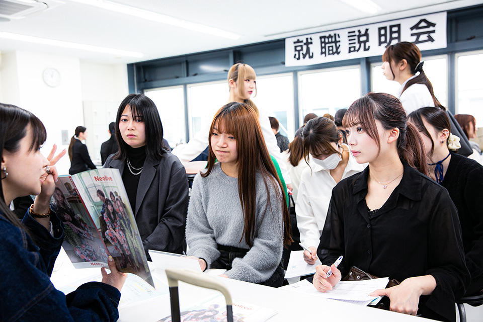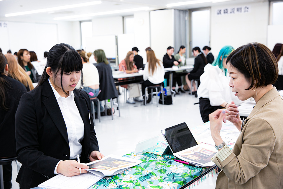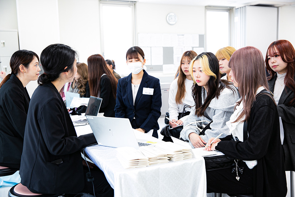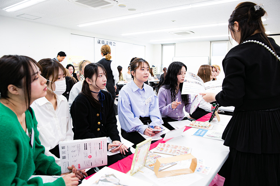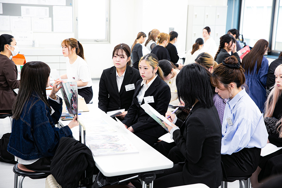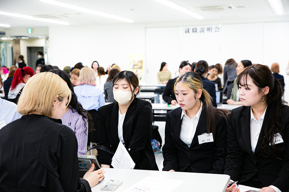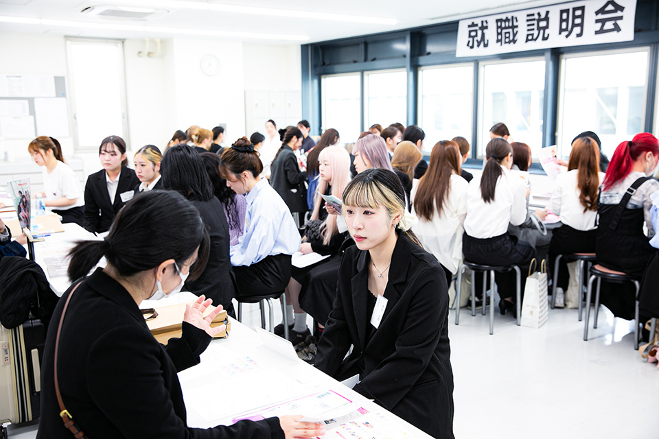 2025年度の就職説明会を開催いたしました。エステティシャン、ビューティアドバイザー、ネイリスト、美容師、アイリスト、ブライダルスタイリストにヘアメイクなど、キレイの世界のスペシャリストとなるために、日々技術を磨くビューティプロ生。