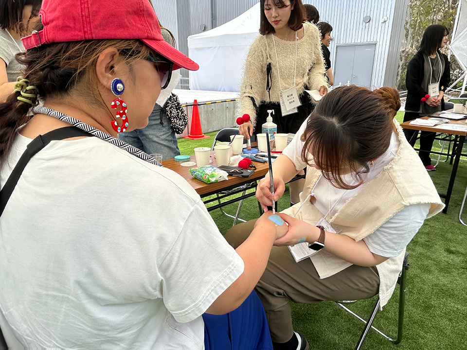 まずは自分たちの手に見本のペイントを施してお客様へアピール。
